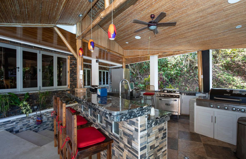 The pool and rancho area are perfect for entertaining guests. The rancho features a full kitchen with granite counters, stove top, and gas barbecue. The beautiful teak ceiling covers the dining area, and a TV is available for outdoor entertainment. A full bathroom and changing area by the pool provide additional convenience.