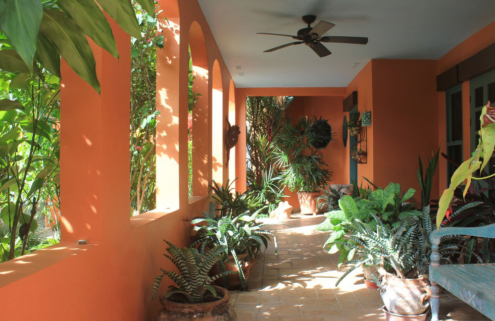 Architectural details abound, including an arched entry gate and a dramatic curved staircase with Talavera tile risers. The second floor hosts two bedrooms, each with its unique charm and access to a front veranda and a spacious terrace. The bathroom on this level is adorned with a Mexican sink and jungle murals, adding a touch of artistry to your daily routine. There is also a rooftop deck with a large solar system which supplements most of the power bill and can be connected to a backup battery for when the power is out if someone wants to expand the system.