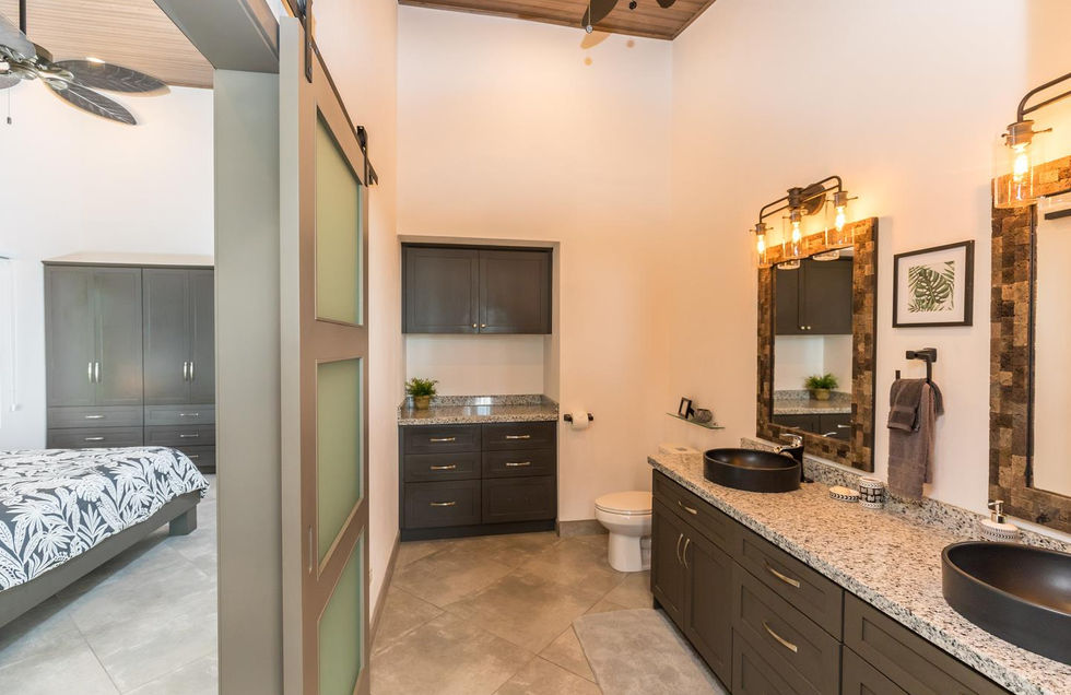 The two guest bedrooms each have their own en-suite full bathrooms with dual sinks, mirrors, and, of course, ocean view showers. These rooms would easily be considered principal bedrooms in any other home. Additionally, each guest room has its own covered terrace, providing stunning views of the ocean and surrounding forest. The rooms are equipped with armoire closets and rustic-style hardwood slab vanities or desks.