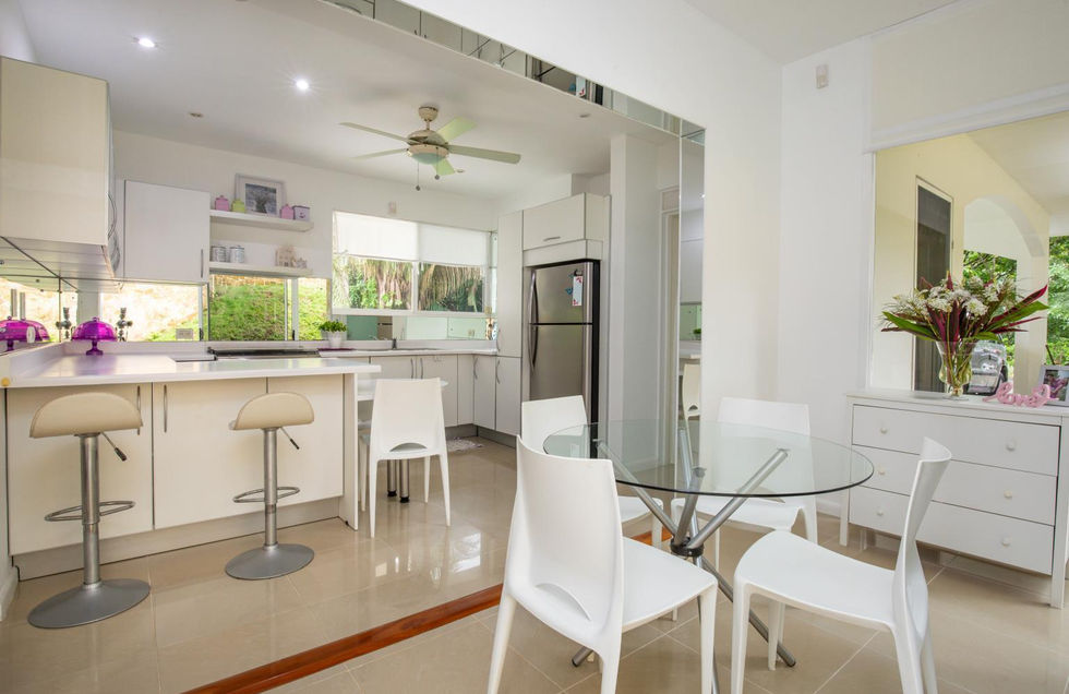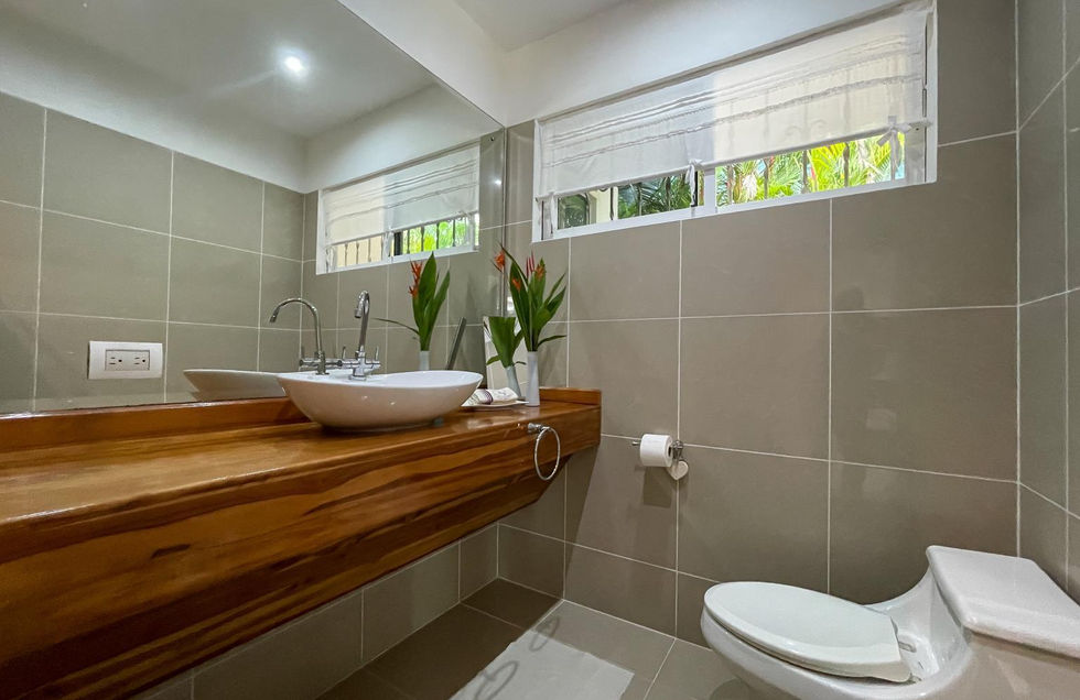 Upstairs, the master bedroom boasts two balconies with different views, a full bath with double sinks, a bidet, and the same beautiful porcelanato tiles. The well-equipped kitchen features top-notch appliances, a breakfast bar, and clever mirrors that add depth and bring the outside in. Step outside to the paved area and admire the stunning ginger-colored stone retaining wall that separates the property from its neighbors.