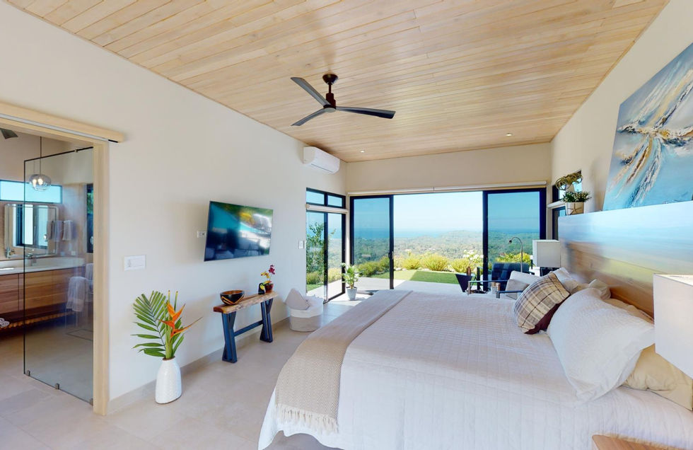 As you approach the home, a magnificent interlocking brick driveway leads to the single-story structure perched atop a secluded ridge offering breathtaking panoramic views of sunrises and sunsets. The four-bedroom, four-bathroom house is divided into two wings, each with its own master suite and guest bedroom. The great room, which separates the two wings, boasts expansive frameless glass doors that provide views of the Pacific Coast and Talamanca Mountains. These all-weather doors are designed to withstand tropical conditions while maintaining your view and allowing for optimal air flow.