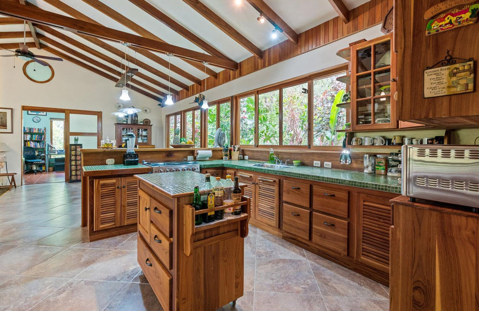 The main house boasts a warm and inviting open floor plan, with vaulted ceilings constructed from a mix of exotic woods like teak, oak, corteza, and cristobal. The kitchen is equipped with ample counter space and an island, perfect for preparing fresh and delicious meals. The living room opens up to a study with a charming wood-burning stove and the potential to be converted into a third bedroom or a space for a pull-out sofa bed.