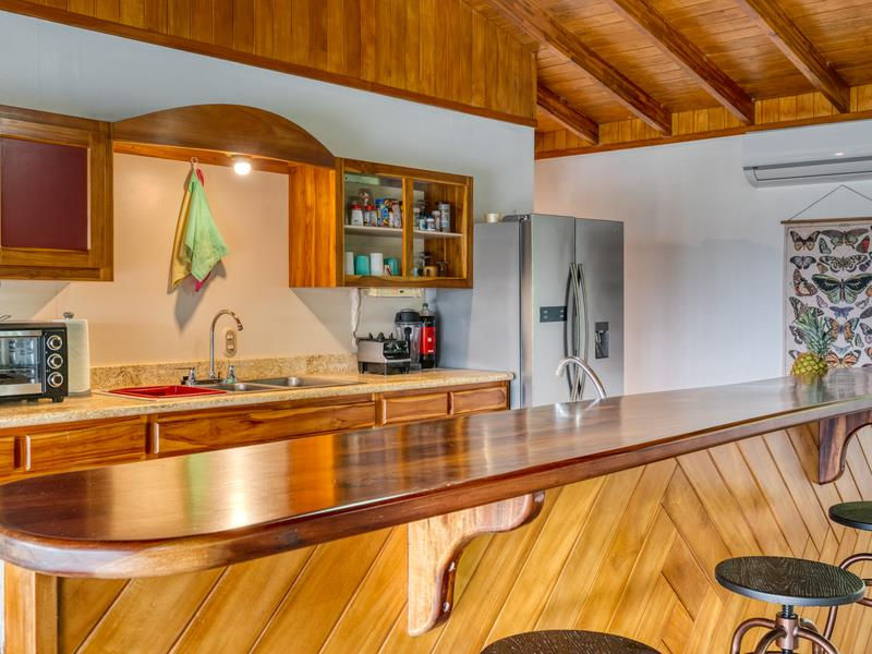 The kitchen is equipped with hand-crafted wood cabinetry, a breakfast bar, two sinks, and top-of-the-line appliances. It is the perfect place to prepare delicious meals made from the fruit picked from your very own fruit trees.