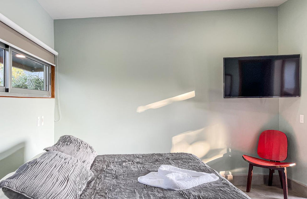 Each bedroom features a Smart TV (50" or 55"), air conditioning, and an ensuite bathroom with a balcony offering either mountain or ocean views. The property is designed to accommodate groups of 10, with ample common areas and plush mattresses for a quality sleep.