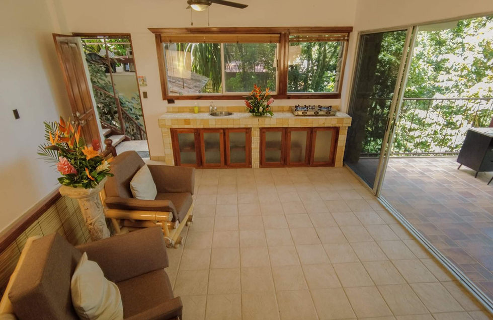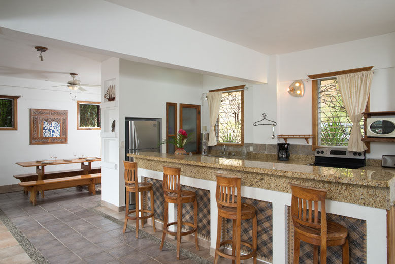 The main house of Casa Manakin comprises a generously sized living, dining, and kitchen area, all seamlessly connected to an expansive sundeck and a refreshing ocean-view swimming pool. These spaces are perfect for relaxation while you enjoy mesmerizing sunsets over the Bay of Quepos. The main home features large picture windows that flood the interiors with ample sunlight, creating a tropical ambiance. You'll find all the modern amenities you need, including cable TV, wireless internet, telephone services, and a well-equipped kitchen. Whether you're watching monkeys frolic on the sundeck or savoring a delicious BBQ while witnessing the stunning Costa Rican sunset, this villa offers the perfect backdrop.