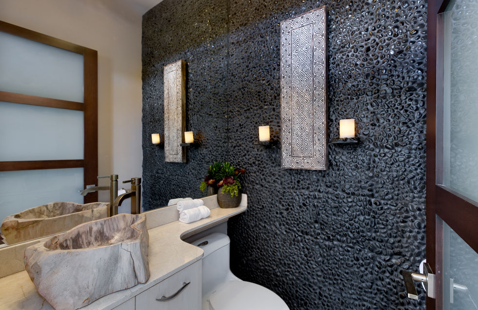 On the main level, two guest rooms grace one side of the villa, sharing access to a convenient jack-and-jill bathroom. The primary guest room enjoys ocean views and opens onto its own outdoor terrace, offering a pathway to the main outdoor living space and pool. The primary king bedroom occupies the opposite wing of the villa, welcoming you with stunning ocean vistas each morning. It features a walk-through closet, secure owner's storage, and a private terrace. The primary en-suite is a masterpiece, with double marble sinks and an indoor/outdoor shower adorned with intricate stone detailing. The main level also houses a half bathroom with a petrified wood sink and a stunning stone feature wall, as well as a laundry room complete with a sink.