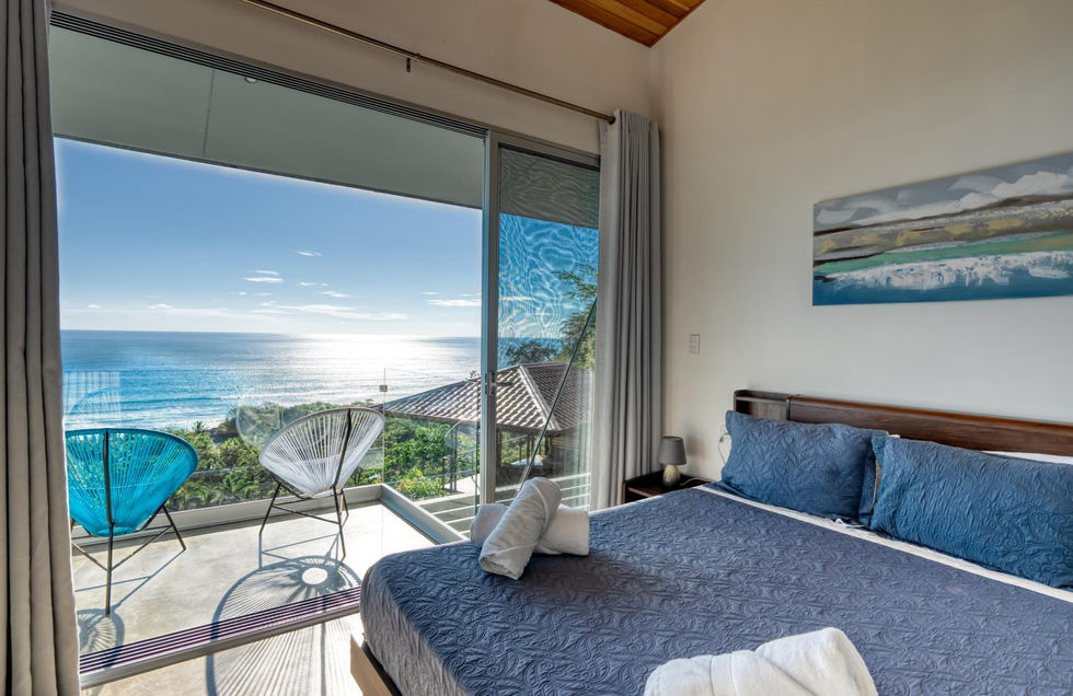 Climb the wooden staircase to the bedrooms, including a spacious master suite with a king-size bed, built-in storage, and an ensuite bathroom with a double vanity and ocean-view shower. Two additional bedrooms, a bathroom, and a utility room with a washer and dryer round out the space. All rooms are air-conditioned.