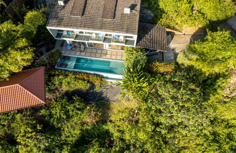 Entertain in style on the covered terrace, complete with an infinity pool and pool deck, BBQ station, outdoor sofa, and swings. Enjoy a fully landscaped yard with tropical plants, trees, and a relaxing bench. This home also features covered parking for two cars (a 4x4 is recommended due to the steep incline).