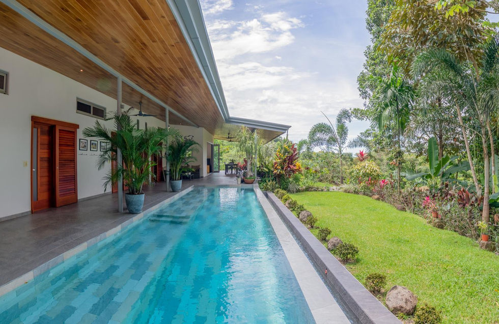 Outside each bedroom patio entrance, you'll find outdoor seating areas and a 3x12-meter swimming pool, inviting you to cool off and soak in the tropical ambiance. The meticulously landscaped grounds showcase local trees, vibrant flowers, and stone pavers, creating a serene oasis. A covered carport and garage provide convenient storage space for vehicles and projects.